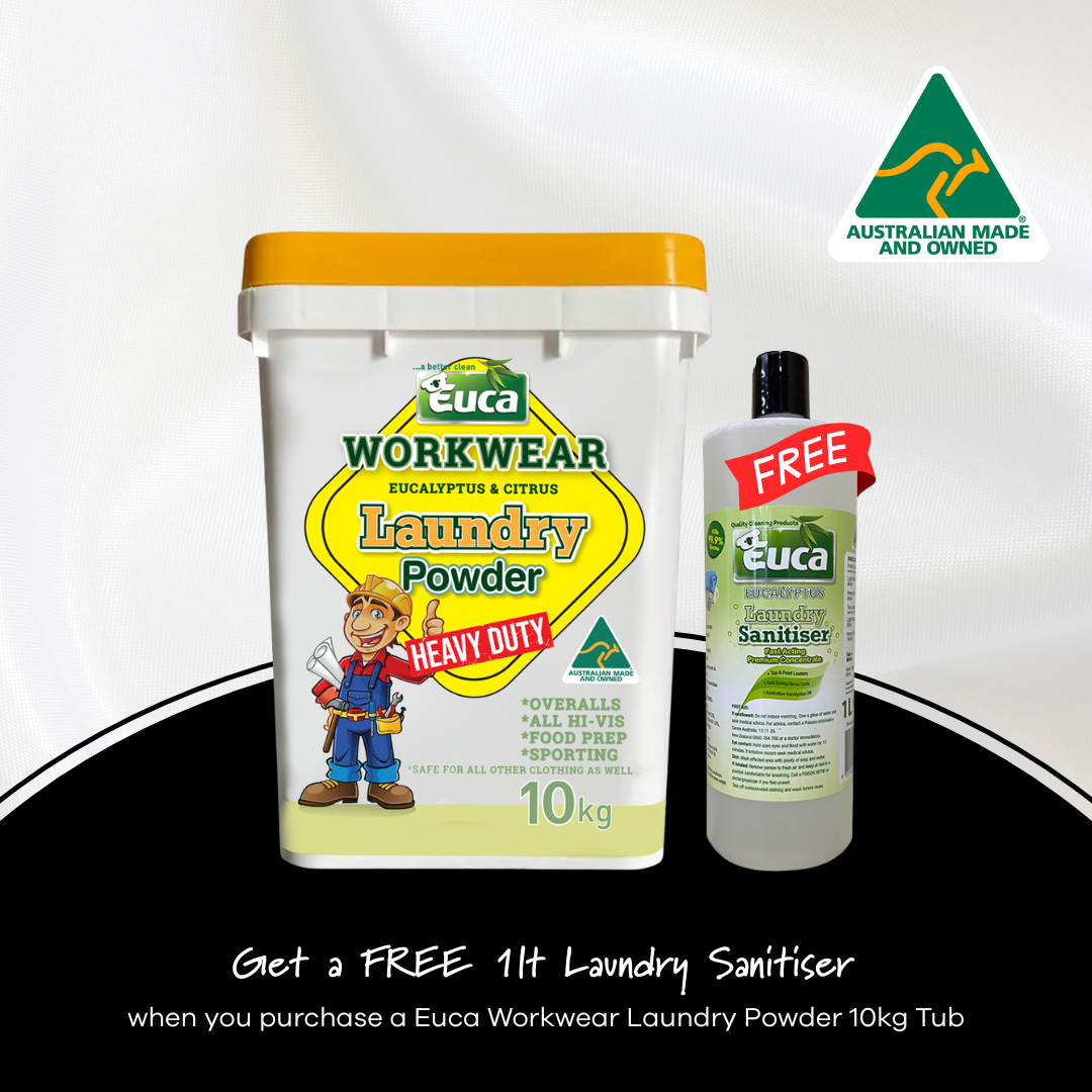 Euca Workwear Heavy Duty Laundry Powder 10kg plastic tub + LAUNDRY SANITISER LIQUID EUCALYPTUS 1LT