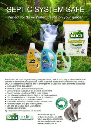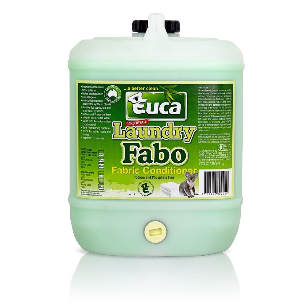 Australian made highly concentrated final wash aid that will enrich your fabrics to make them feel luxurious, softer and fresher plus also make your ironing easier. It has anti-static properties that make it particularly good for all synthetic blend fabrics. Euca Fabo utilises Australian eucalyptus oil to clean plus deodorise naturally, is sodium and phosphate free and ideal for top and front loading washes. Euca Fabo is suitable for all septic, bio and grey water systems, is low allergenic for those with skin sensitivities.