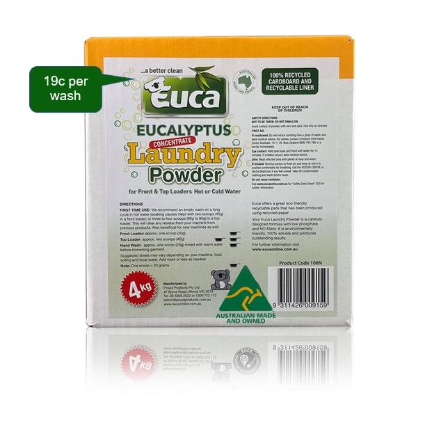 Available in a handy 10pk travel sachets, 1kg, 2kg, 4kg, 8kg Eco refill Box, 10kg tub, 20kg drum and a new 4Kg Eco Box Euca Laundry Powder now with two essential oils, in the most ecological packaging we currently have. Euca is well renowned for using Eucalyptus in nearly all Euca products. That’s where Euca comes from, short for Eucalyptus. The team at Euca are also aware that there are some great alternatives in essential oils that not only perform as well as Eucalyptus, but offer a unique change in fragrance for those that do not prefer Eucalyptus. Tested, and tested again to make sure all the key points of the original Eucalyptus Euca Laundry powder is met or surpassed. Exceptional cleaning, 100% soluble, greywater and septic system safe, ecologically friendly, contains no nasties to upset allergy sufferers and as always will clean and look after your washing machine. Still exceptionally concentrated so you will use less, which makes Euca such an economical value for money Laundry Product like no other. Euca really saves you money.