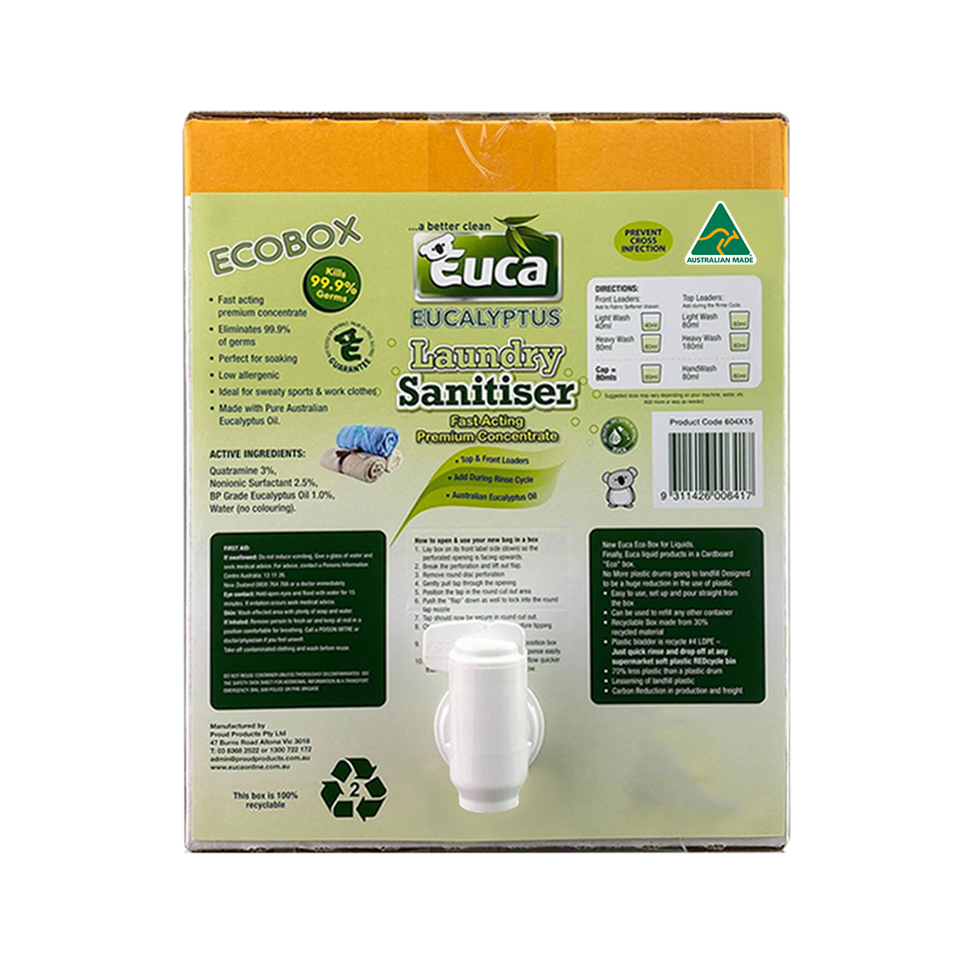 Did you know that your laundry could make you sick too? Since germs and all sorts of nasties can live for hours on porous surfaces like clothing, it poses the risk of spreading the to other laundry items. In addition, most microorganisms present in soiled laundry survive the normal wash cycle; hence hanging your washing on the line was one of the most important means to refresh and sterilise your clothes. But in todays fast and compact world we rely on airers and drying machines . So Euca Laundry Sanitiser with Broad Spectrum Bacteriacide was born, to add to the rinse cycle of any load, to disinfect and prevent cross infection prior to drying which goes a long way towards totally eliminating those germs and nasties. Also adds a slight hint of Eucalyptus to your dry clothes and washed items