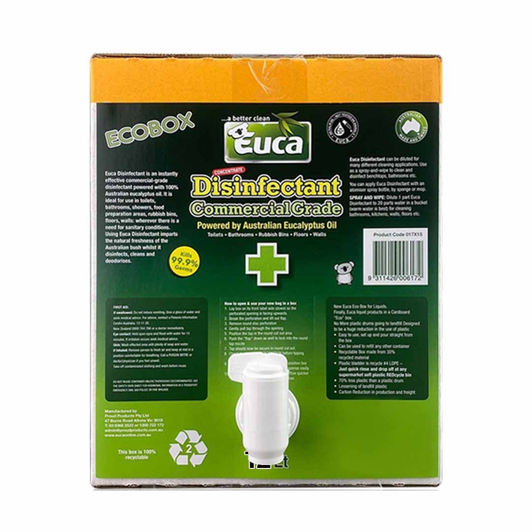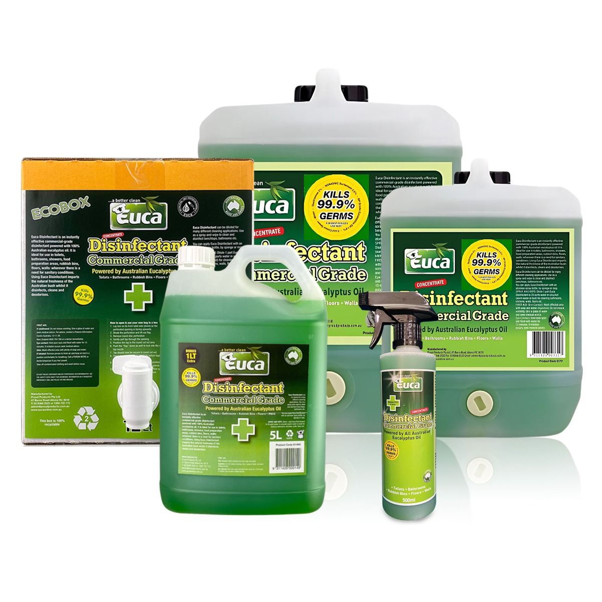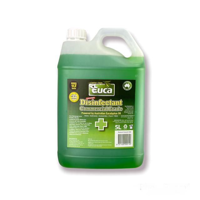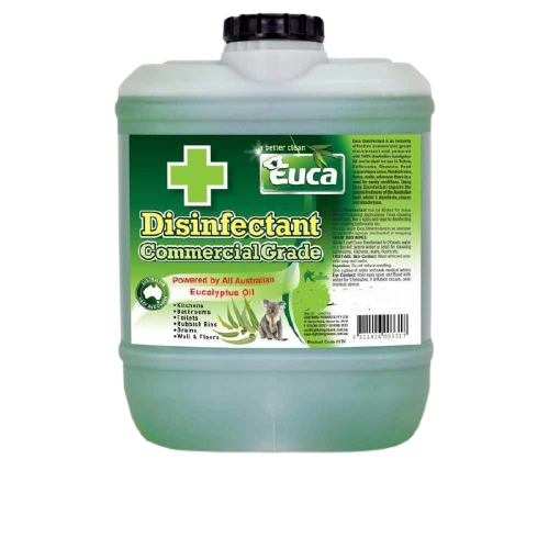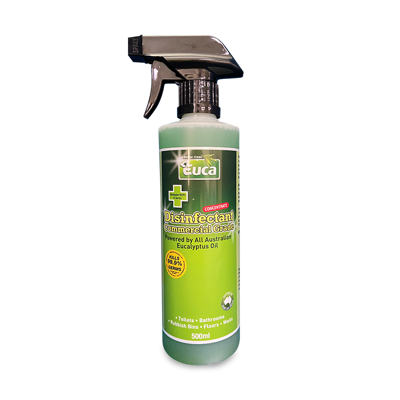 Euca Disinfectant is a Commercial Grade Concentrate Cleaning Product made from 100% Australian Eucalyptus Oil, with no other artificial fragrances added. This powerful formula cleans as well as deodorises. Ideal for use in toilets, bathrooms, showers, rubbish bins, walls and floors. Can even be used in your laundry!
